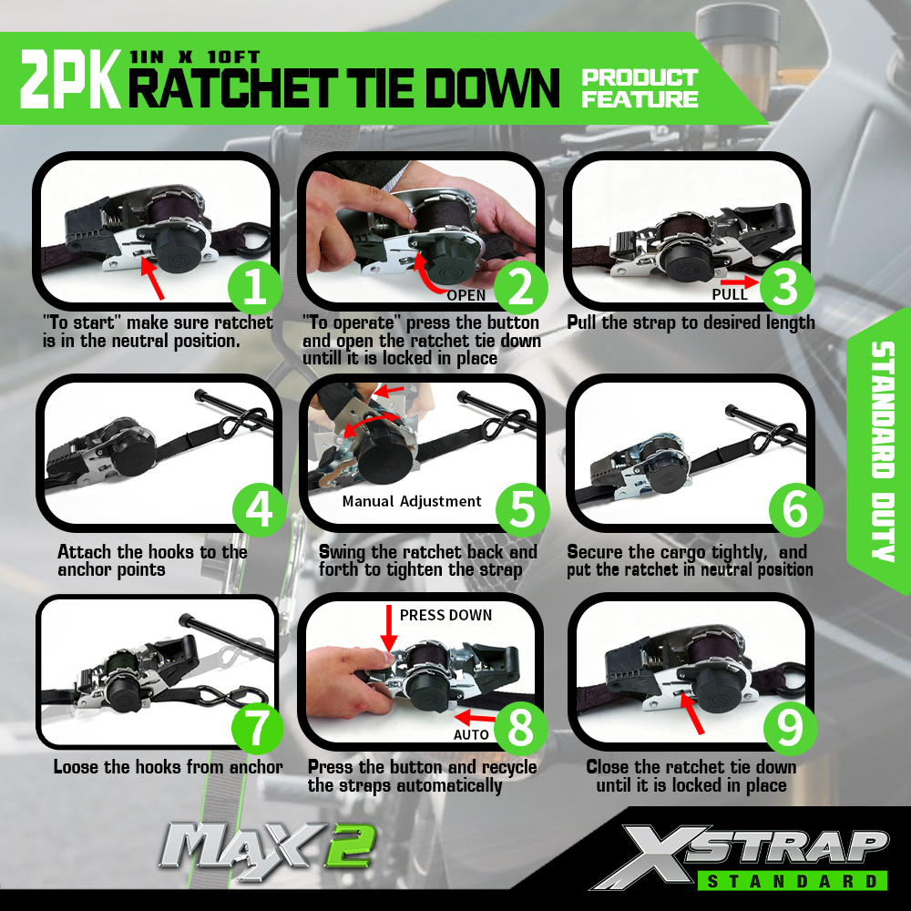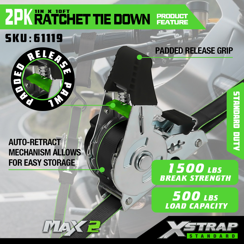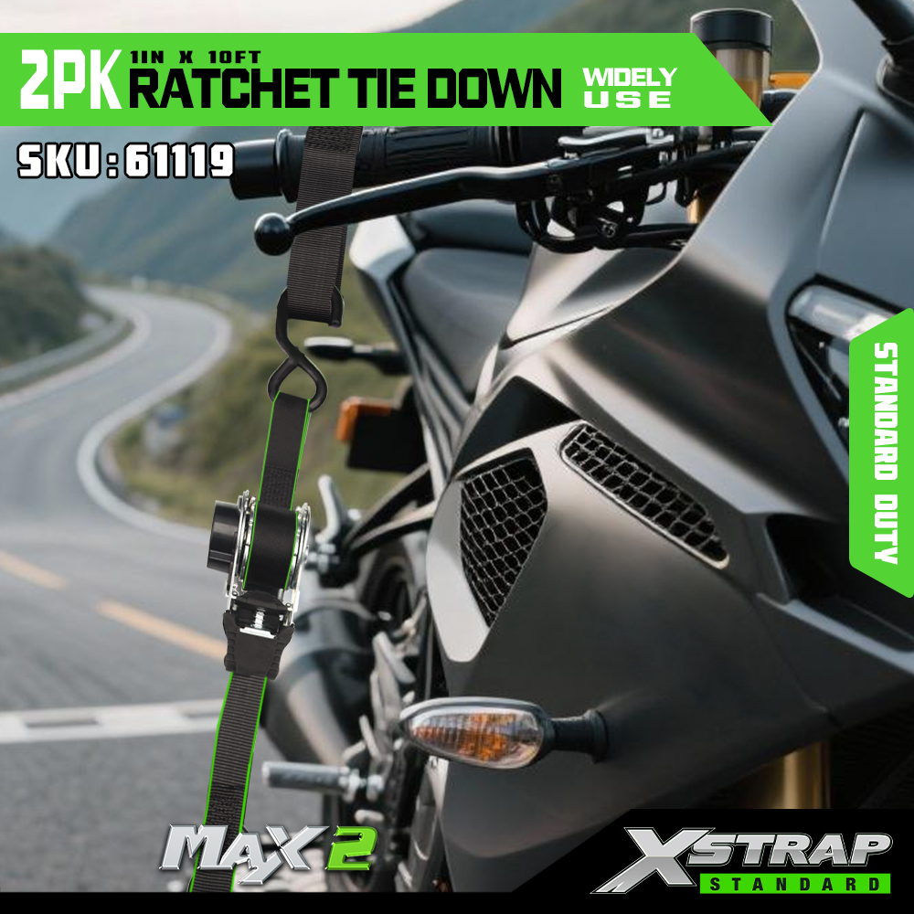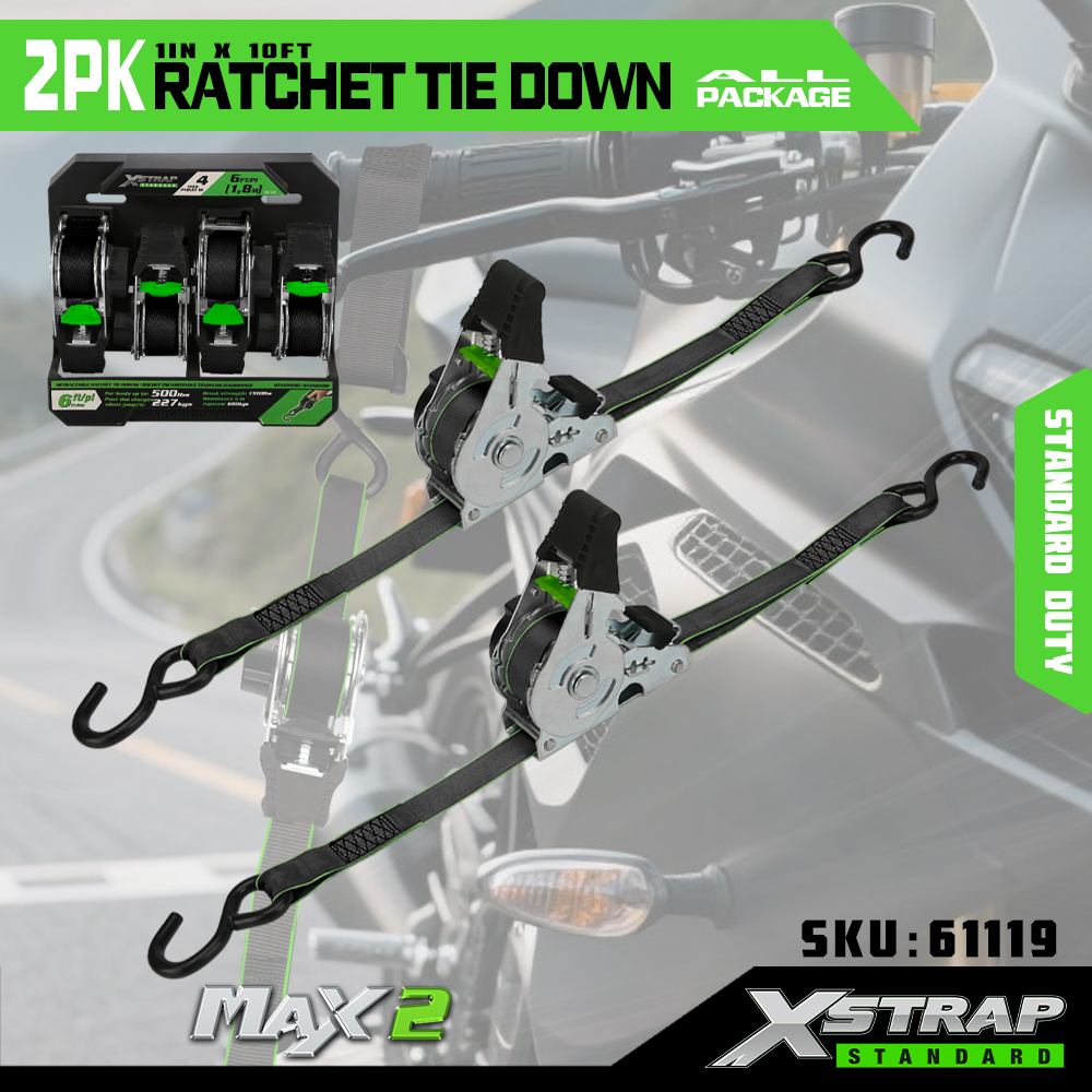 Xstrap 2 Pack Ratchet Tie Down, 1” x 10' Polyesterový upínací popruh Stahovací ráčnový popruh, Nosnost 500 liber, zajišťovací popruhy pro uchycení nákladu s S háčky pro pickup, SUV, motocykly, lehký rybářský člun, vodní skútr, sněžný skútr, zahradní skútr.