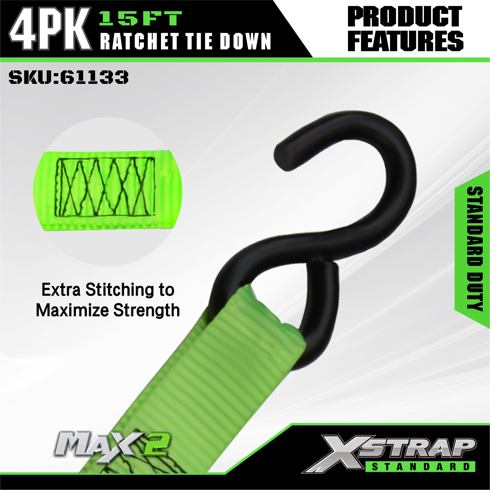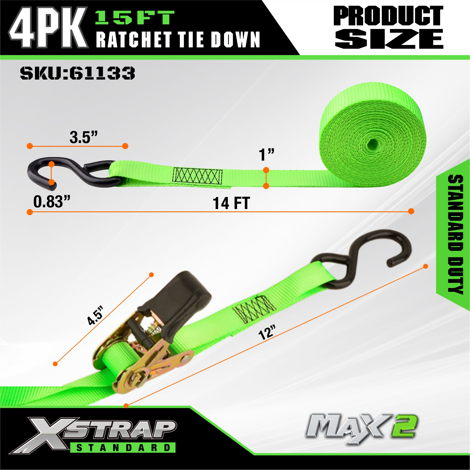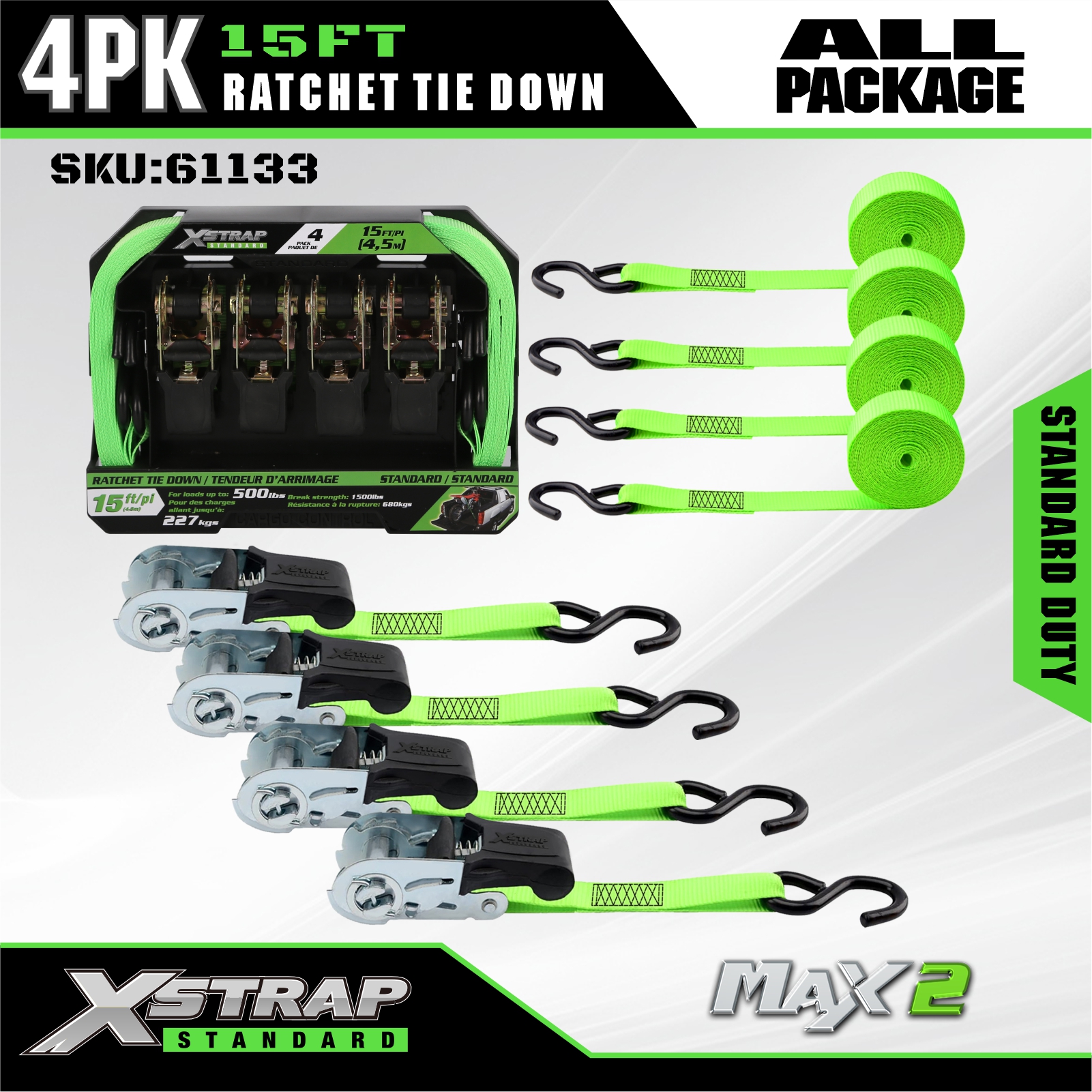 Xstrap 4 Pack Ratchet Tie Down, 1” x 15' Polyesterový upínací popruh s ráčnou, 500 lbs kapacitní popruhy pro upevnění nákladu s S háčky pro pickup, SUV, automobilové nosiče, motocykl, lehký rybářský člun, vodní skútr, sněžný skútr, zahradní traktor.