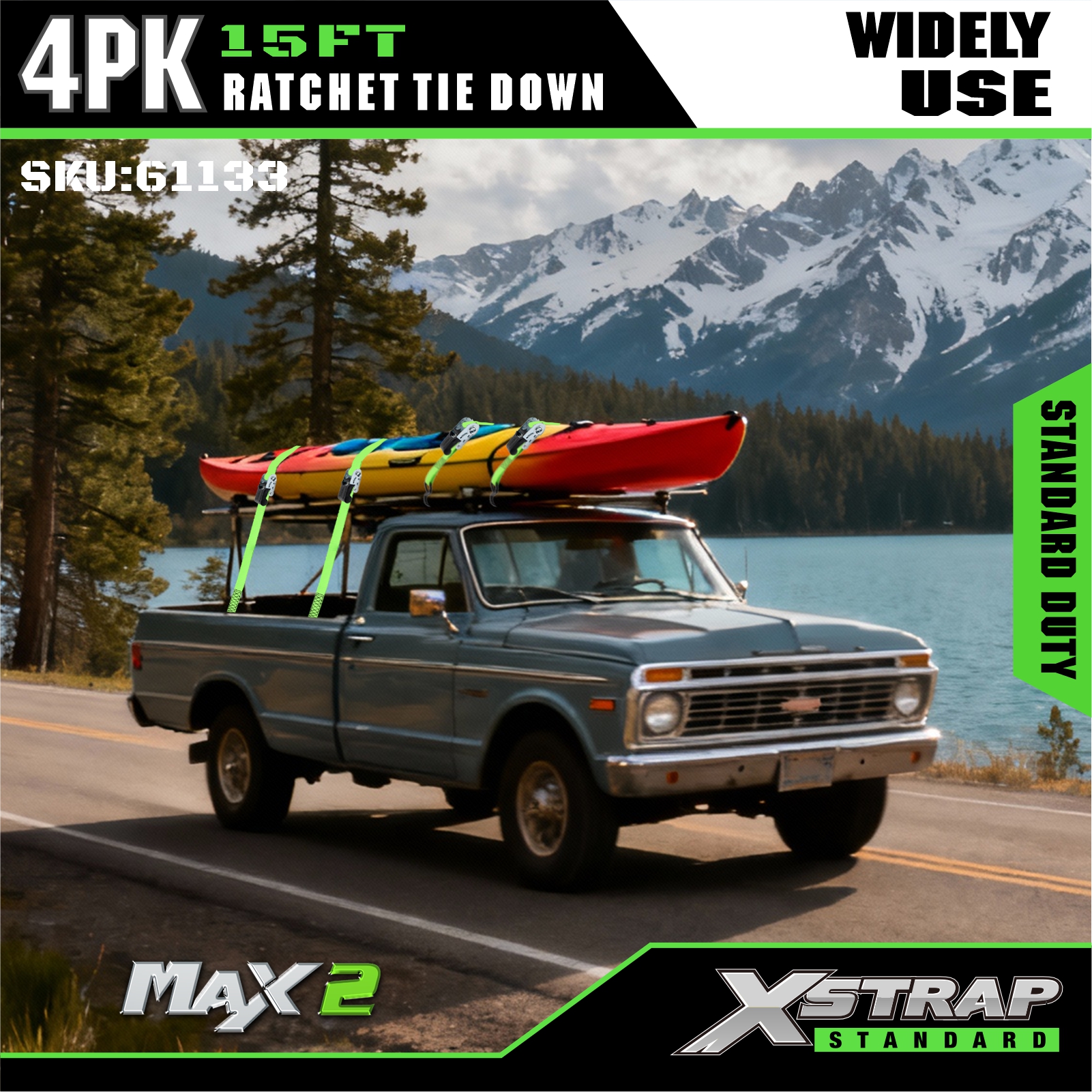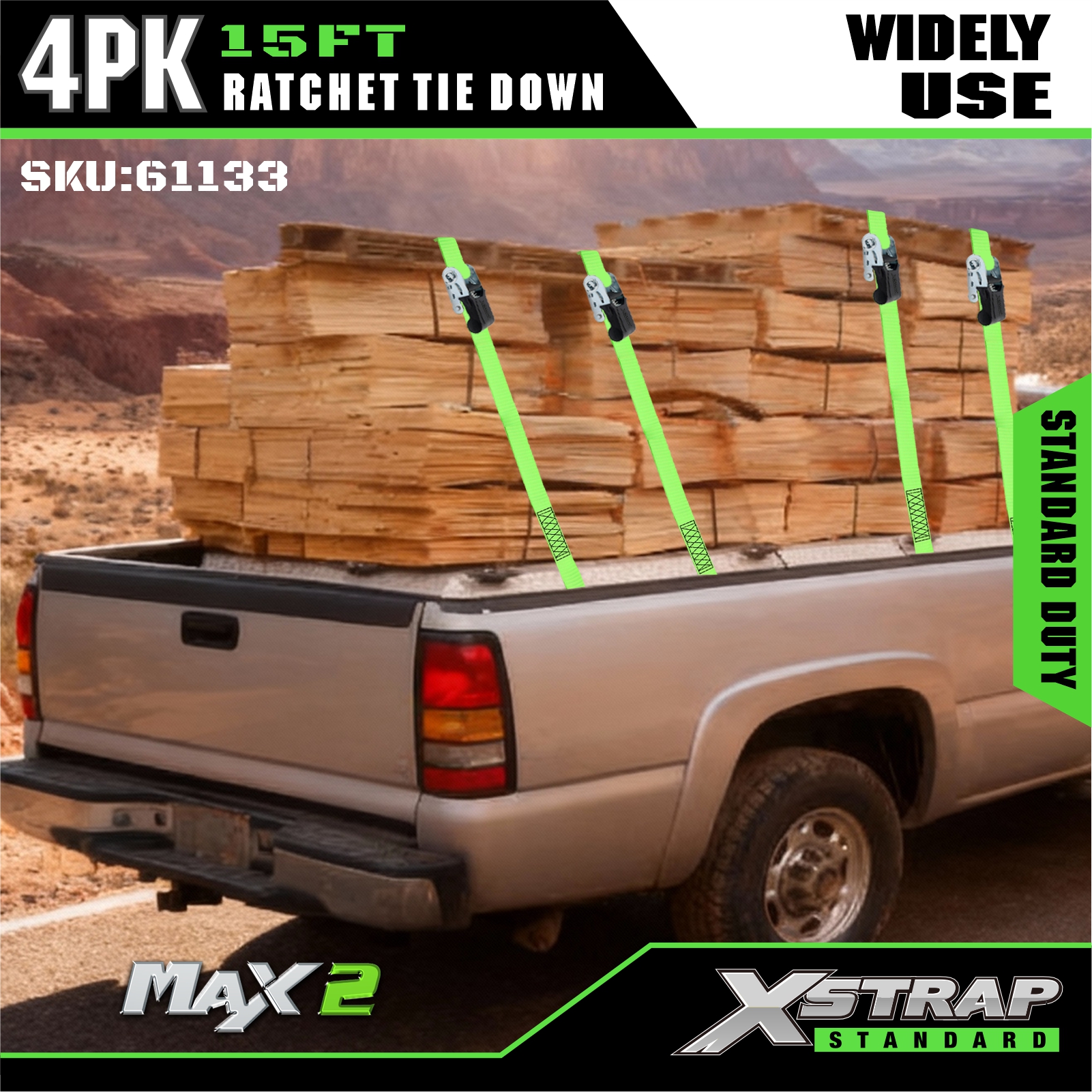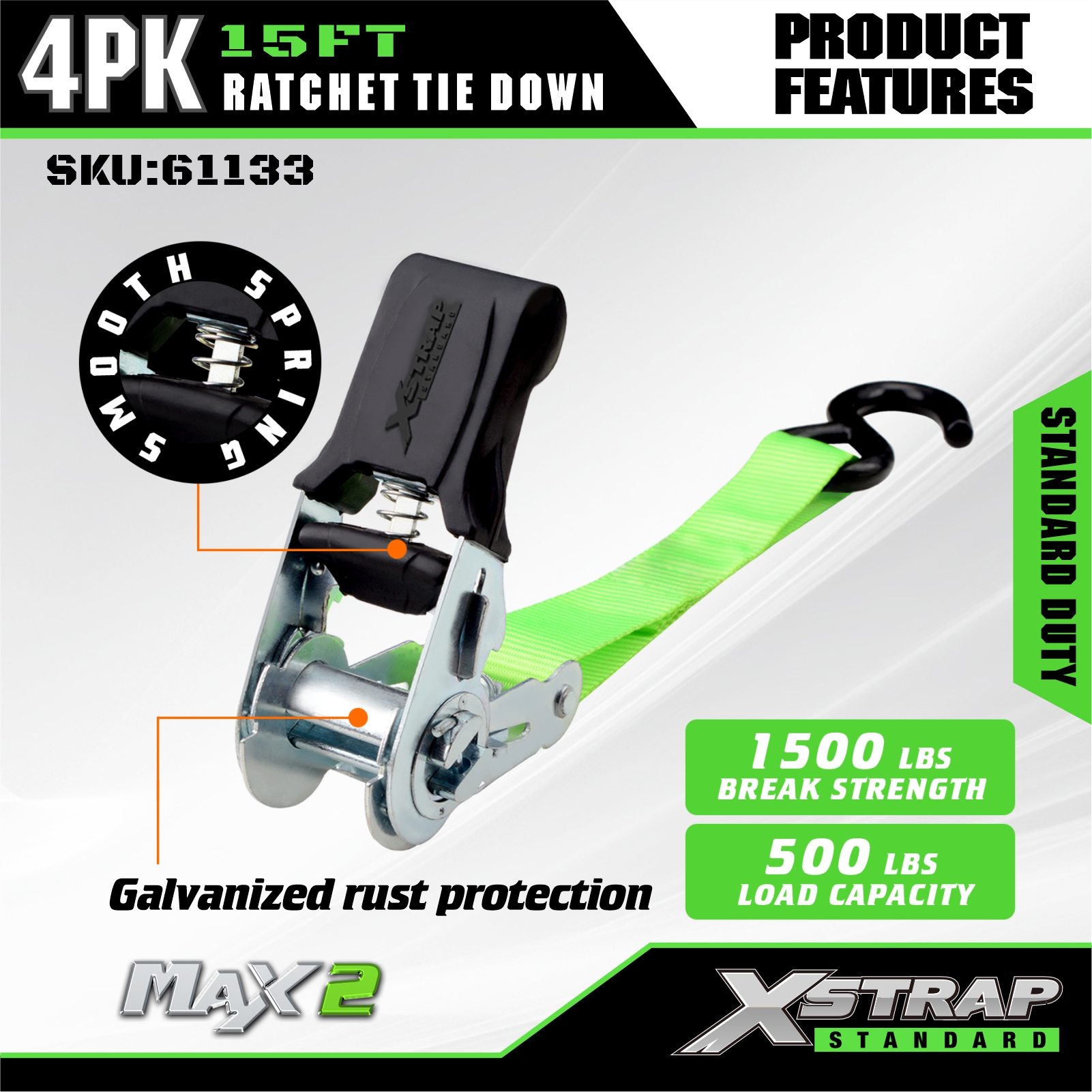 Xstrap 4 Pack Ratchet Tie Down, 1” x 15' Polyesterový upínací popruh s ráčnou, 500 lbs kapacitní popruhy pro upevnění nákladu s S háčky pro pickup, SUV, automobilové nosiče, motocykl, lehký rybářský člun, vodní skútr, sněžný skútr, zahradní traktor.