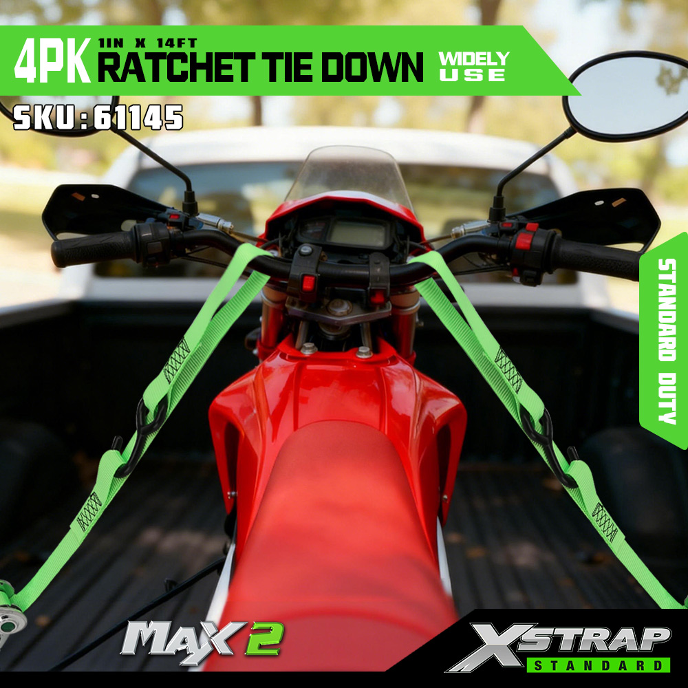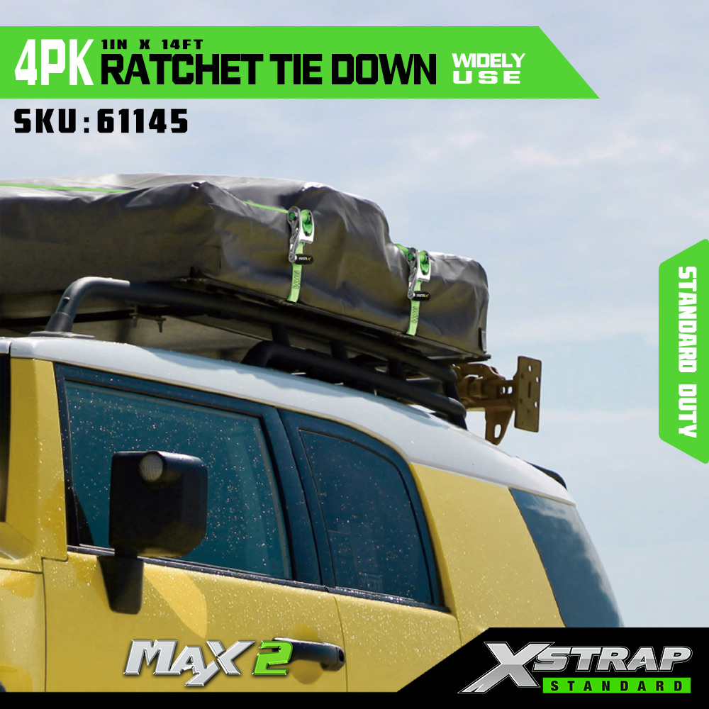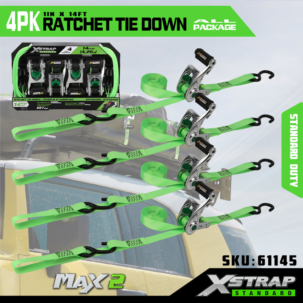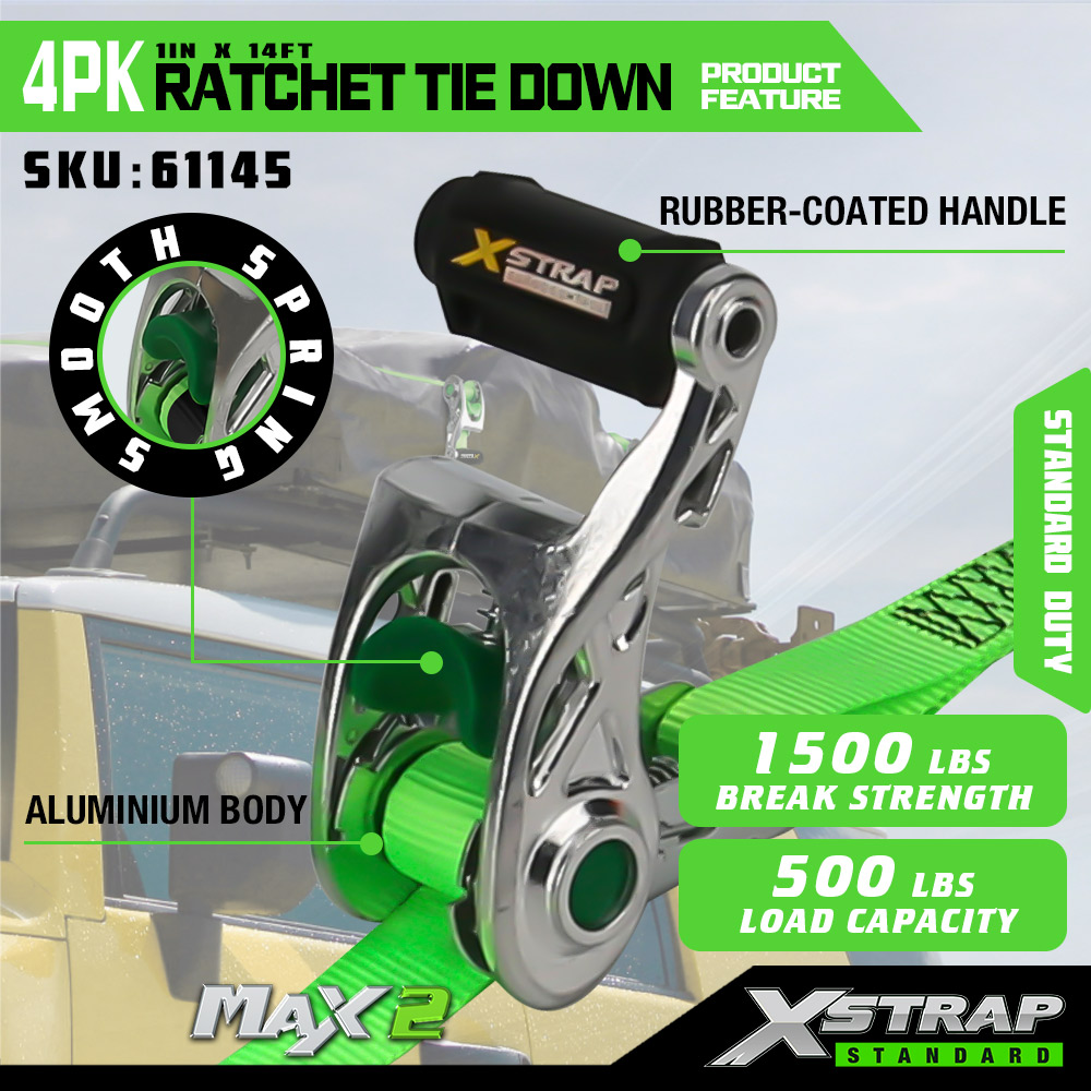 Xstrap 4 balení ráčnového upínacího popruhu s měkkou smyčkou, 1” x 14” polyesterový upínací pásek stahovací ráčnový popruh, 1000 lbs kapacitní popruhy pro upevnění nákladu s S háčky pro nákladní automobily, SUV, motocykly s horními nosiči automobilů.
