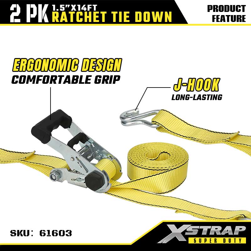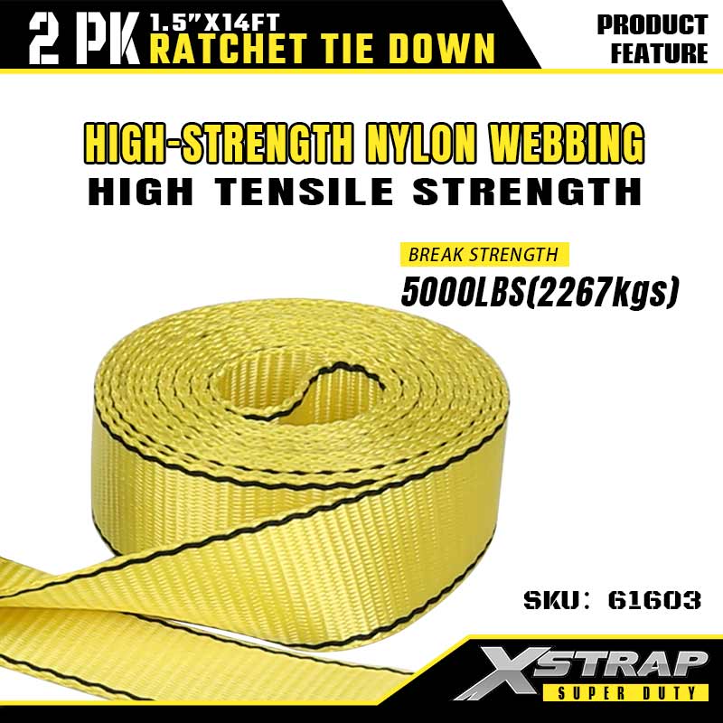 - Nylonový popruh s vysokou pevností (pevnost v přetržení 5000 LBS): Vyrobený z vysoce pevných žlutých nylonových popruhů (šířka 1,5") — poskytuje výjimečnou pevnost v tahu (zatížení při přetržení 5000 LBS) a odolnost proti oděru, ideální pro těžké přepravy nebo průmyslové upevňovací úkoly.l