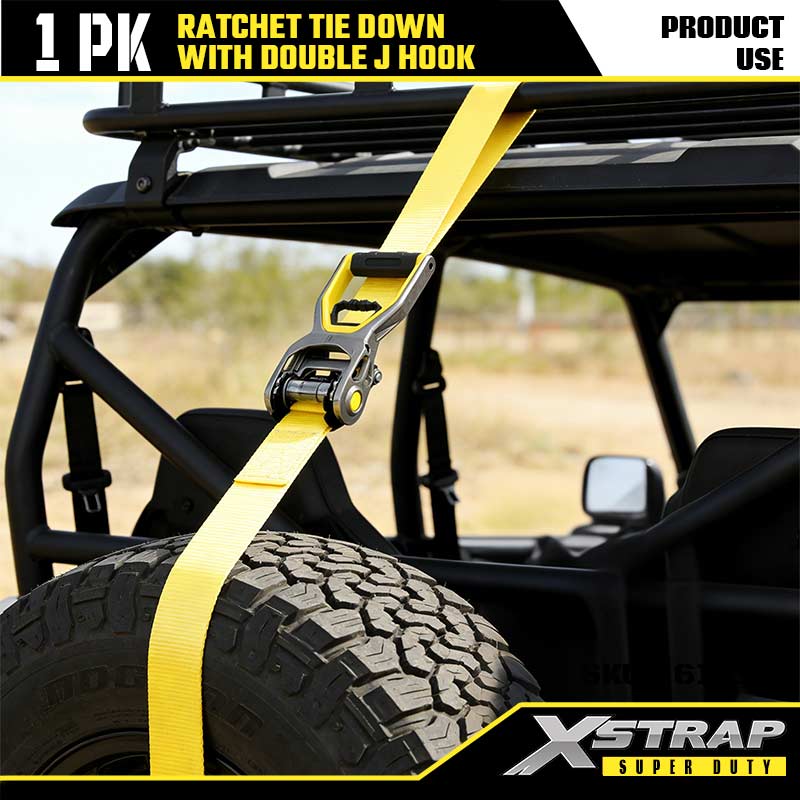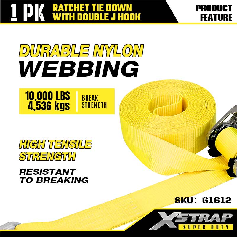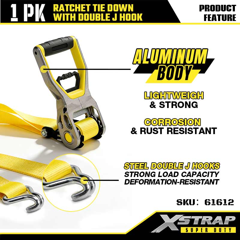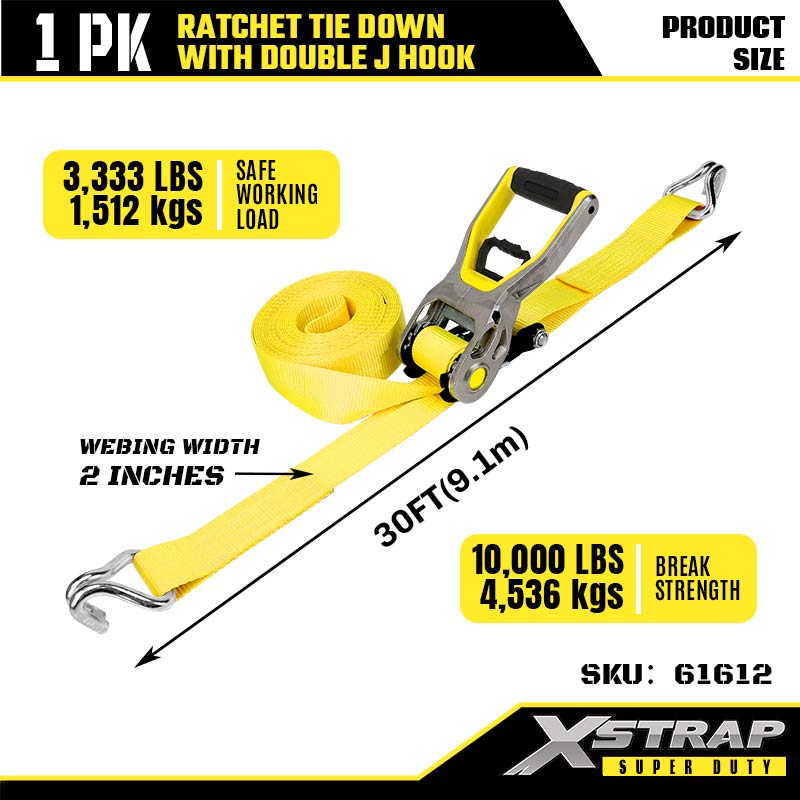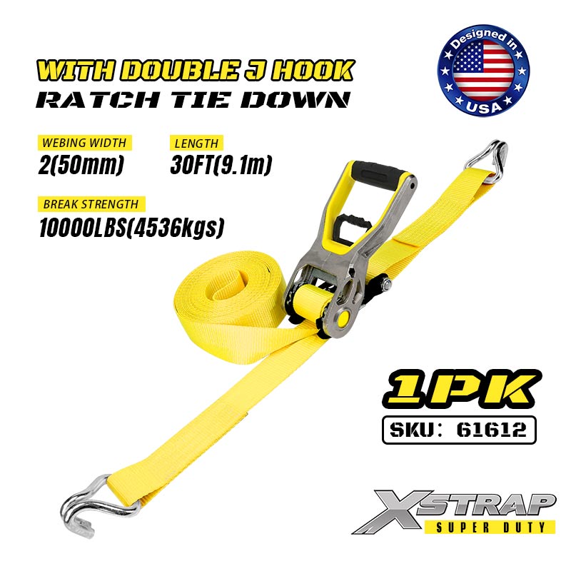 Uvazovací popruh Xstrap 2PK s dvojitými J háky, 2” x 30’ polyesterový upínací popruh s ráčnou, 3333 lbs kapacitní popruhy pro zajištění nákladu s dvojitými J háky pro těžký přívěs, plochý přívěs lyžařský člun, malé auto, těžké vybavení.