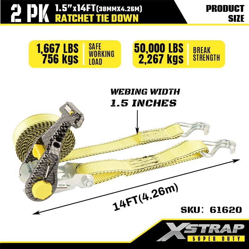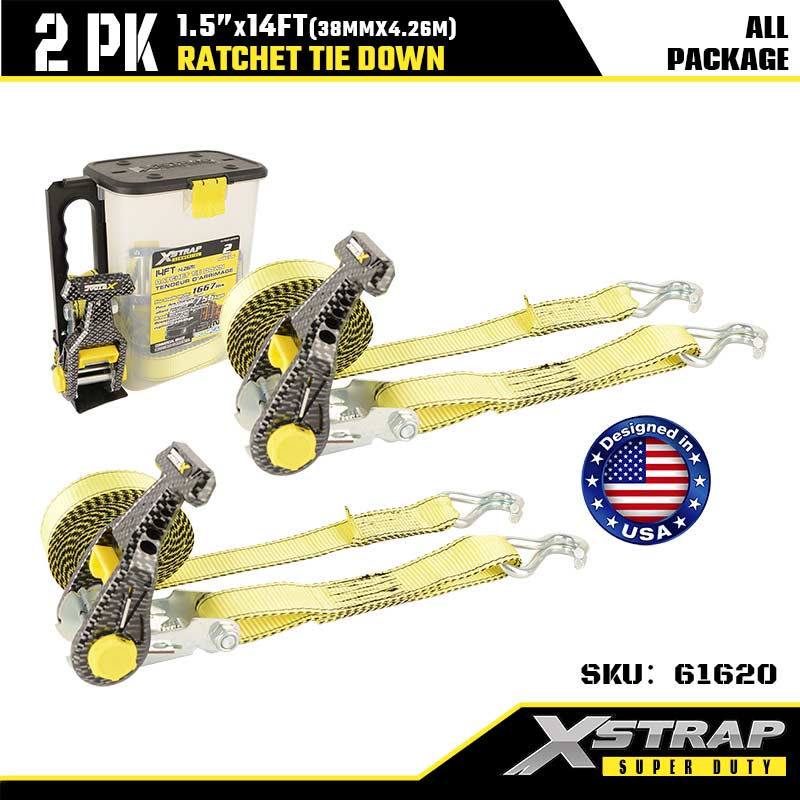 Xstrap 2PK Ratcet Upevňovací popruhy s dvojitými J háky, 1-1/2” x 14' Polyesterový upínací popruh Ratchet strap, Nosnost 1667 lbs popruhy pro zajištění nákladu s dvojitými J háčky pro těžký přívěs, plochý přívěs lyžařský člun, malé auto, těžké vybavení.