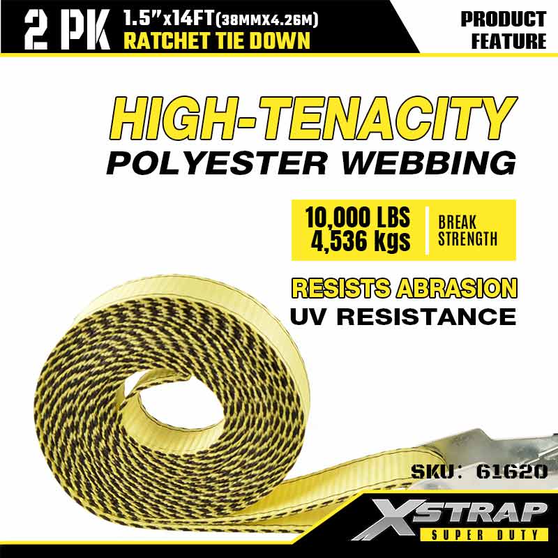 - Polyesterový popruh s vysokou pevností: 1,5 palce široký polyesterový popruh používá černožlutý tkaný design, aby odolal třepení, roztahování a oděru. Je odolný proti UV záření, aby odolal slunci a dešti, takže zůstává pevný i při dlouhodobém používání na staveništích nebo na cestách.